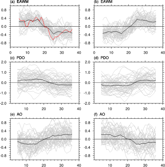 图1. CMIP5模式的工业革命前气候控制试验中,依据滑动t检验挑选出的东亚冬季风显著减弱的个例对应的(a)东亚冬季风指数(9年滑动平均;灰线)及其集合平均(黑线),(c)太平洋年代际振荡指数(9年滑动平均;灰线)及其集合平均(黑线),(e)北极涛动指数(9年滑动平均;灰线)及其集合平均(黑线)。(b, d, f)与(a, c, e)类似,但对应着滑动t检验挑选出的东亚冬季风显著增强的个例。图(a)中的红线为观测中1967−2006年东亚冬季风指数(9年滑动平均)。