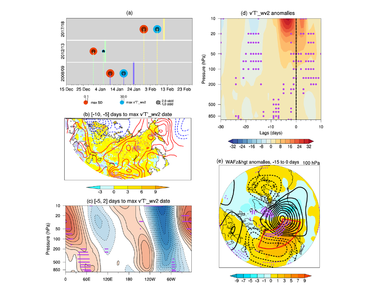 v'T'_wv2 anomalies (max v’T’_wv2) in the three split SSW events (2017/18,