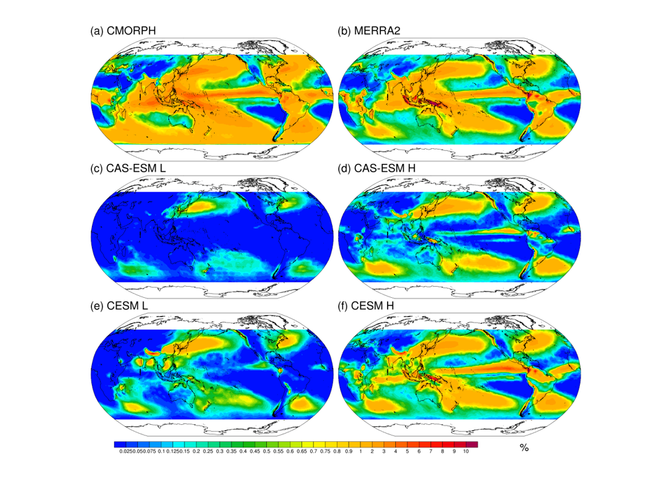降水的频率和强度是降水的重要特征。过去和现在许多研究主要关注模式中逐月或逐日的降水特征,让我们获得了许多认识。通常,降水可分为对流性降水和层状云降水(大尺度降水),这两种类型的降水持续时间、强度及相应的物理过程均不同。因此,逐月/逐日降水特征的结论可能不适用于更高时间分辨率的降水特征。同时,针对高时间分辨率的降水,前人的结果也表明,模式中水平分辨率的改变对降水特征的影响研究很少且存在不确定性。随着数值模式动力框架的改进以及计算机资源的充沛,地球系统模式中水平分辨率的提高将会对逐小时降水的特征带来何种影响?造成影响的机制是什么?这些仍是需要更多研究来回答的问题。