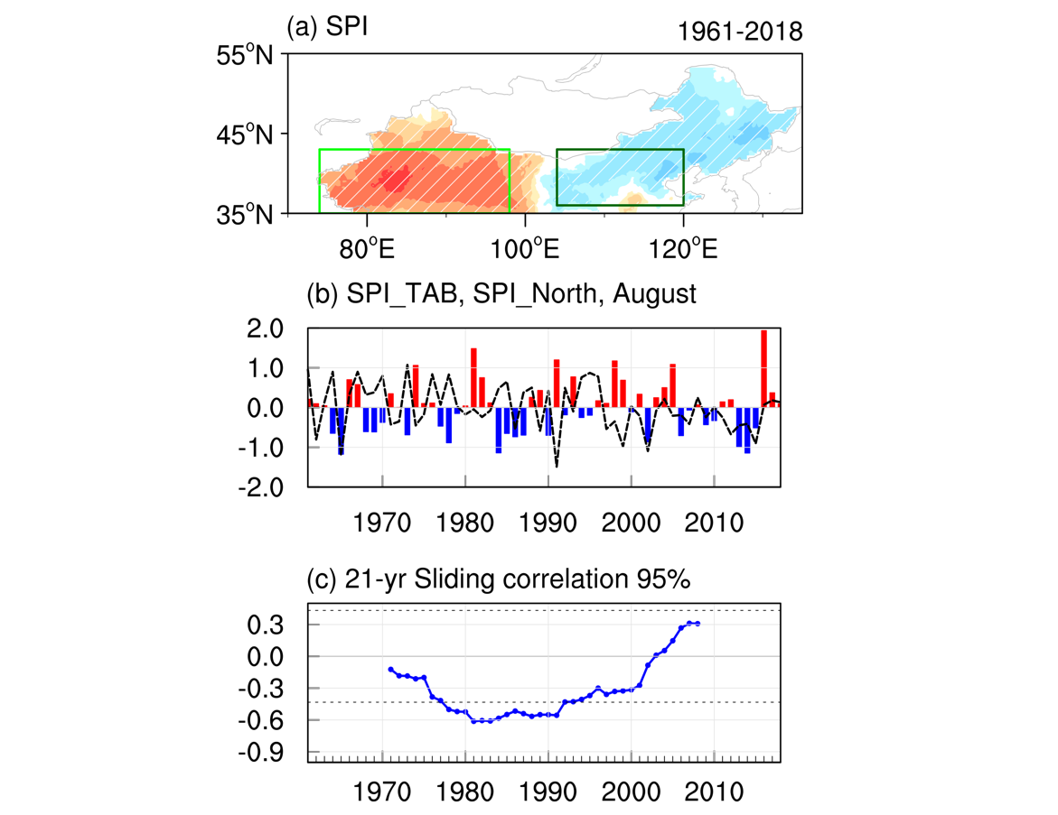 随着全球变暖,我国北方地区极端天气气候事件增加,干旱问题尤为严重。中国北方(35°N以北)8月降水异常有显著的年际及年代际变化(图1):在1968至1992年期间,中国北方降水呈现“西正东负”的异常分布型,即西北地区偏湿,华北偏干;而在1994至2018年期间,西北地区偏湿,但与华北降水异常联系变得不显著。就上述现象,进一步分析发现大西洋海温和局地土壤湿度在中国北方降水变化中起着重要的作用:90年代初期以前,7月中亚土壤偏湿持续到8月,通过陆气相互作用激发局地纬向波列(低层表现为蒙古反气旋异常,西北太平洋气旋异常),使得西北地区降水偏多、华北降水偏少;90年代初期以后,土壤湿度关键区位于东欧平原,7月东欧平原土壤偏湿持续到8月,激发的纬向波列仅到中国西北地区,使得该地上升运动异常、降水偏多。此外,前期北(南)大西洋海温异常是1994-2018年(1968-1992年)中国北方降水异常的前兆信号。研究结果为深入理解中国北方气候干湿变化的季节预测提供重要科学依据。