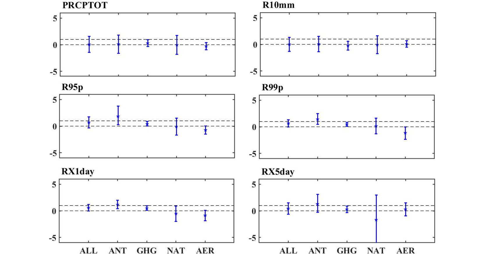 Figure 1. The scaling factors β for PRCPTOT, R10mm, R95p, R99p, RX1day, and RX5day over China from the signal-signal detection analysis of the ALL, ANT, GHG, NAT, and AER forcings.