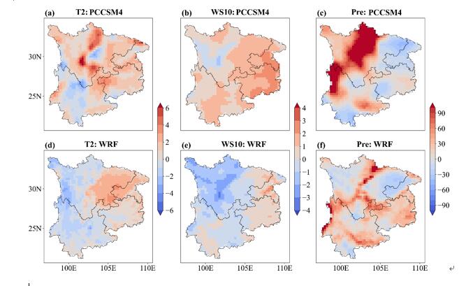 Fig. 1. Spatial distribution of summer mean biases of PCCSM4 (a-c) and WRF (d-f) model for: 2-m temperature (a, d, units: ℃), 10-m wind speed (b, e, units: m/s), (c) precipitation (c, f, units: %) relative to CN05.1.