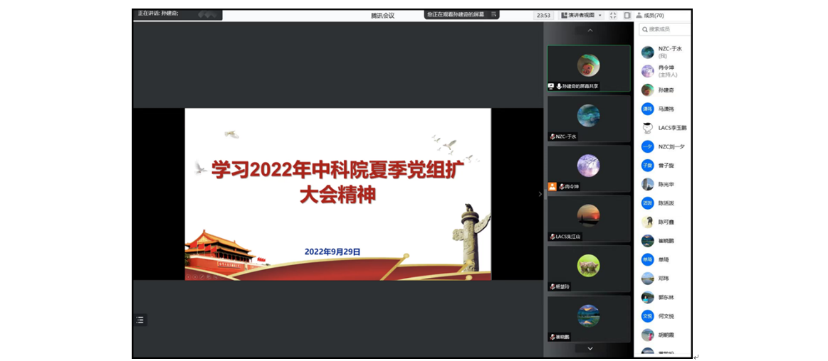 2022年9月27日,支部组织了“喜迎二十大,奋进新征程”的党政知识竞赛。支部党员同志踊跃参加,并在竞赛中学习巩固了党史、时政等方面的知识。2022年9月29日,为了更好地学习和弘扬老科学家精神,NZC党支部在中科院大气所党委的支持下,组织支部党员在线共同观看了以叶笃正先生为原型的微电影《科技脊梁:叶笃正》。同日,与LACS党支部联合举办了“学习2022年中科院夏季党组扩大会议精神”的主题党日活动,邀请了所党委委员孙建奇研究员上党课,活动以线上视频形式开展。孙建奇研究员主要围绕会议任务、内容和贯彻落实要求等方面对2022年中科院夏季党组扩大会议精神进行了详细的介绍和解读。随后,支部党员还深入学习了《中华人民共和国科学技术进步法》、《习近平经济思想学习纲要》等文件精神。
