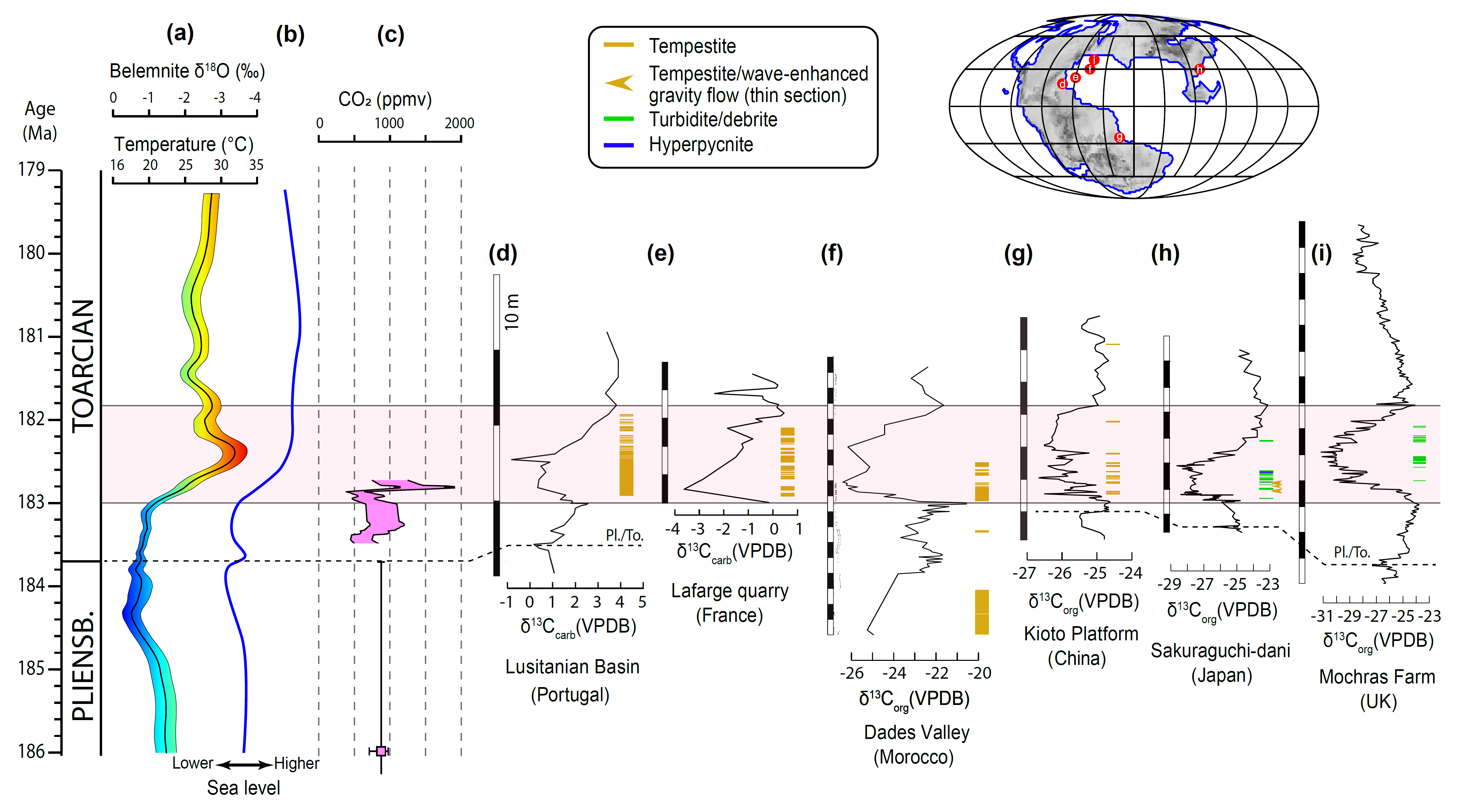 图1. 侏罗纪Toarcian极热期气候变化(a-c)及关键TC沉积记录(d-i)。
