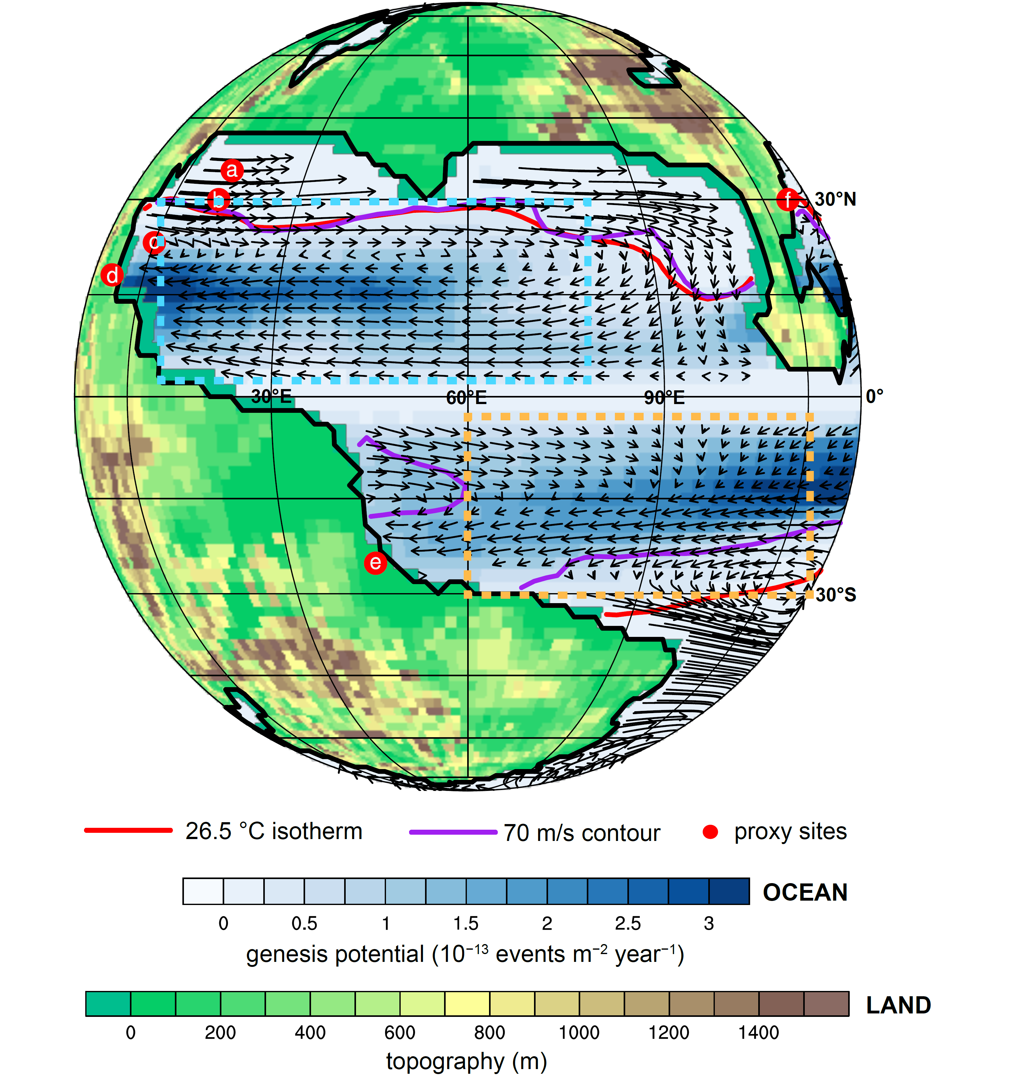 图2. 模拟的侏罗纪Toarcian极热期热带气旋潜在生成位置(蓝色填色)及引导气流(箭头)。