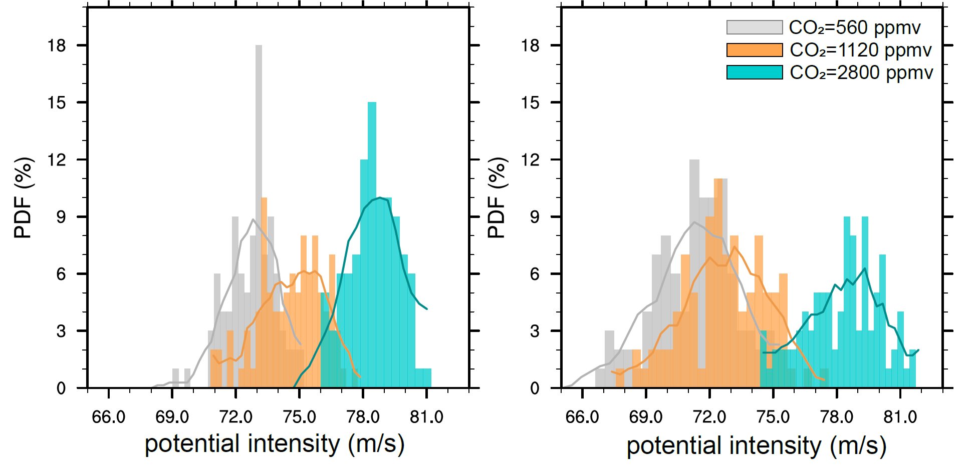 图3.不同CO2浓度下热带气旋潜在强度的概率密度分布(右:北特提斯洋;左:南特提斯洋)。