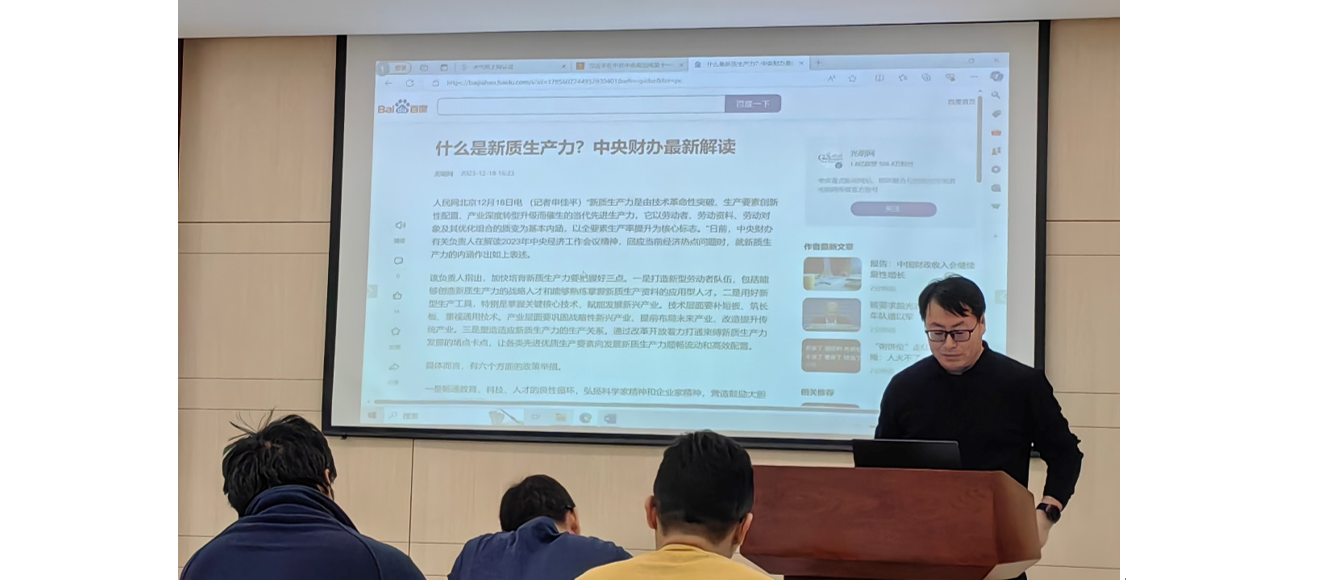 燕青研究员围绕习总书记主持的中共中央政治局第十一次集体学习,详细介绍了如何“加快发展新质生产力”和“扎实推进高质量发展”,并回顾了新时代以来我国高质量发展取得的经验,强调发展新质生产力是推动高质量发展的内在要求和重要着力点。随后,于恩涛副研究员向大家介绍了中央财办关于“什么是新质生产力?”的最新解读,指出培育新质生产力要打造新型劳动者队伍,用好新型生产工具,塑造适应新质生产力的生产关系,要以科技创新引领现代化产业体系建设。